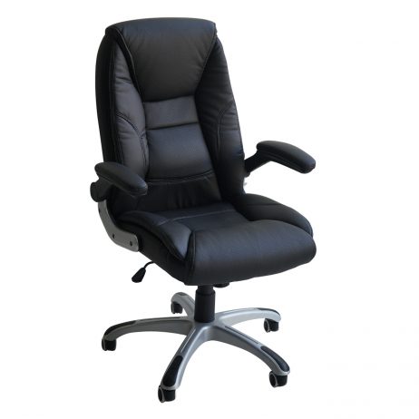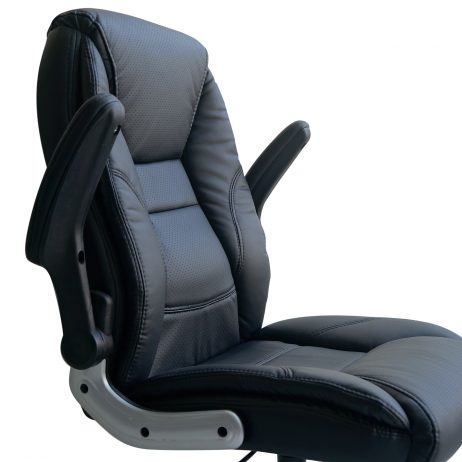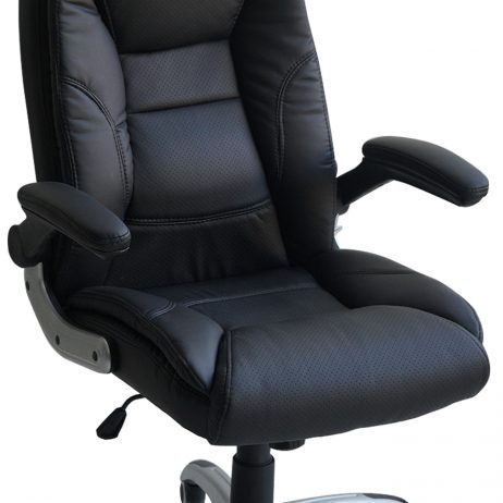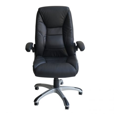 Sillón giratorio con diseño ergonómico y brazos graduables. Asiento y respaldo tapizado en tela tipo malla color negro. Base cromada de 5 aspas, deslizable mediante 5 garruchas de nylon. Sistema regulable.