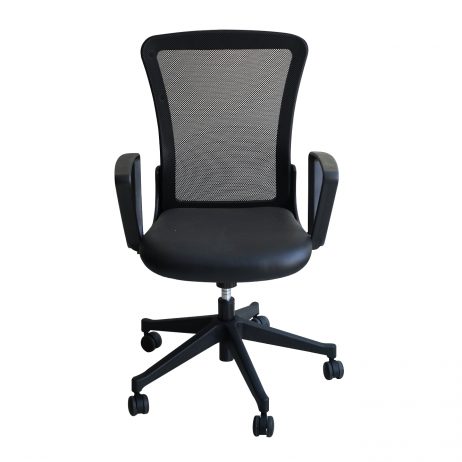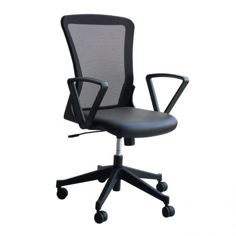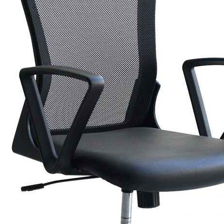 Silla giratoria con brazos fijos, sistema ergonómico, asiento en unipiel negro y respaldos tapizados en tela tipo malla, sistema regulable, color negro.