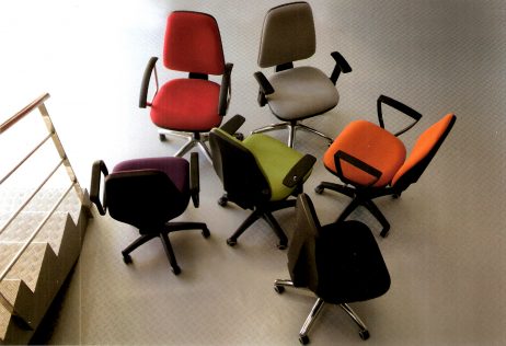 Con respaldo alto, reclinable, graduable en altura, sistema neumático, base de 5 aspas deslizable mediante 5 garruchas, asiento y respaldo tapizados en unipiel color a elegir.