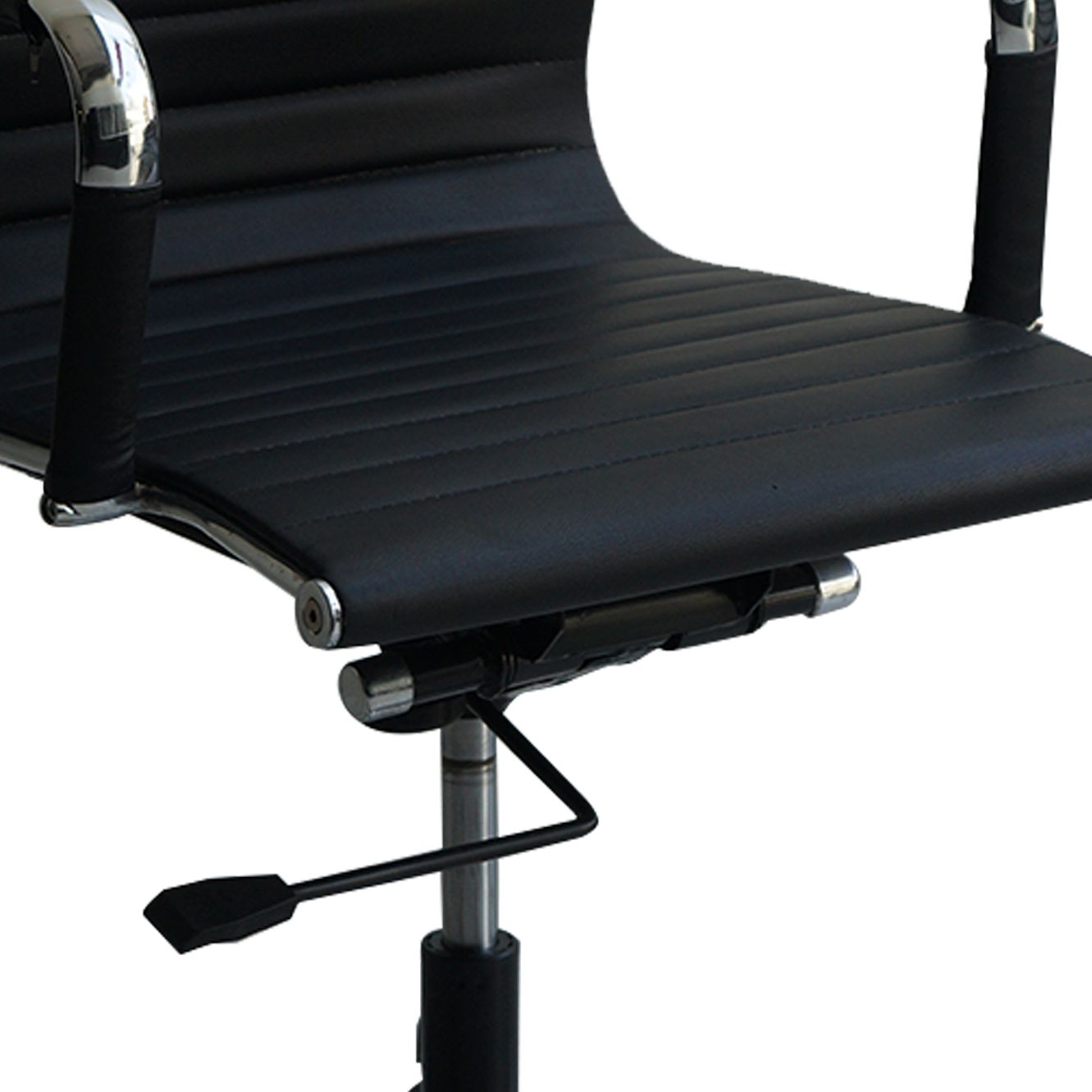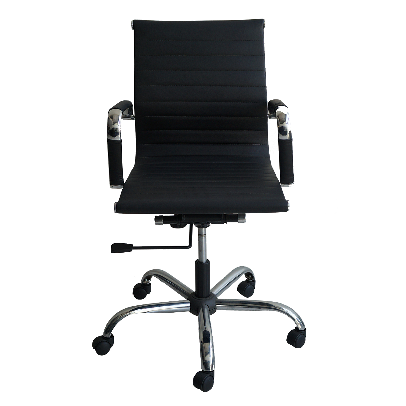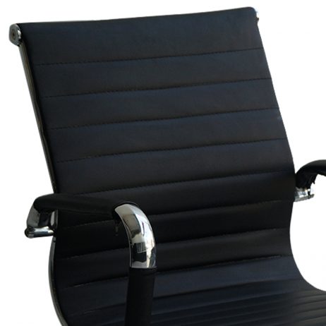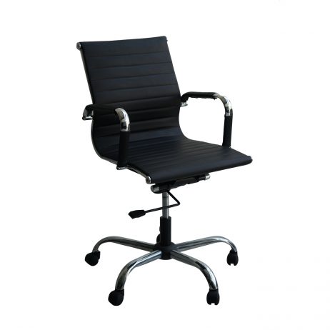 Respaldo alto, reclinable, graduable en altura, sistema neumático, base cromada de 5 aspas deslizable mediante 5 garruchas, tapizado en material tipo cuero acanalado color negro.