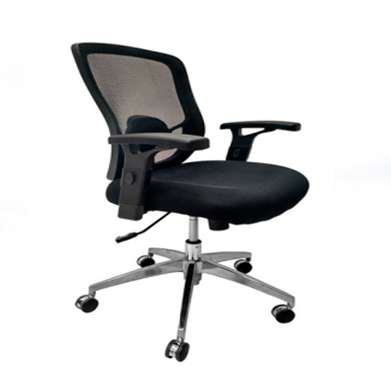 Silla giratoria con brazos regulables, sistema ergonómico, asiento y respaldos tapizados en tela tipo malla, sistema regulable, color negro.